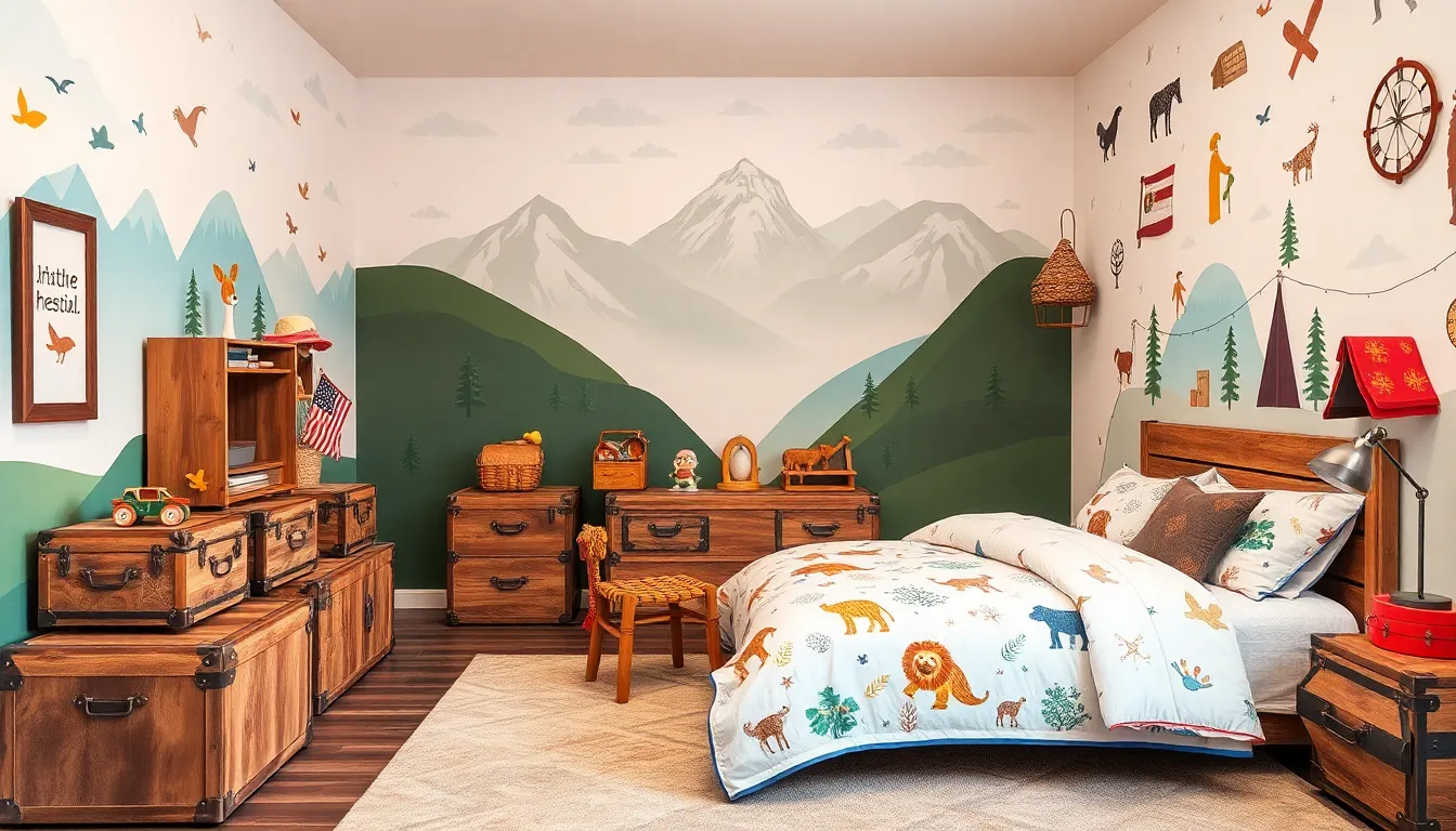 Adventure and exploration themes ignite curiosity. Maps, animal prints, and safari motifs encourage wide-ranging imagination. Mountains painted on walls create a backdrop for adventures in imagination. Bedding featuring explorers or outdoor scenes complements this theme. Incorporating storage solutions like trunks or bins promotes organization, ensuring toys are easily accessible. Wall decals of compasses or tents add excitement, enhancing the adventurous spirit of the room.