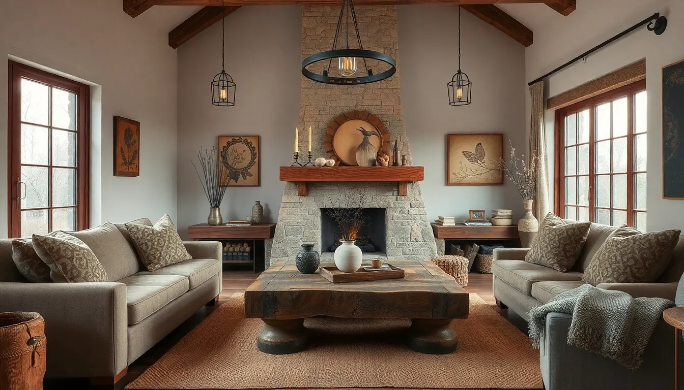 In the living room, start with a reclaimed wood coffee table as a centerpiece. Pair natural fiber rugs with soft, neutral sofas to achieve a balanced look. Add stone accents around the fireplace for a more grounded feel. Layer in woven baskets for both storage and aesthetics. Use vintage or distressed lighting fixtures to cast a welcoming glow across the space. Incorporate potted plants or dried flowers to bring in nature, creating an organic touch.